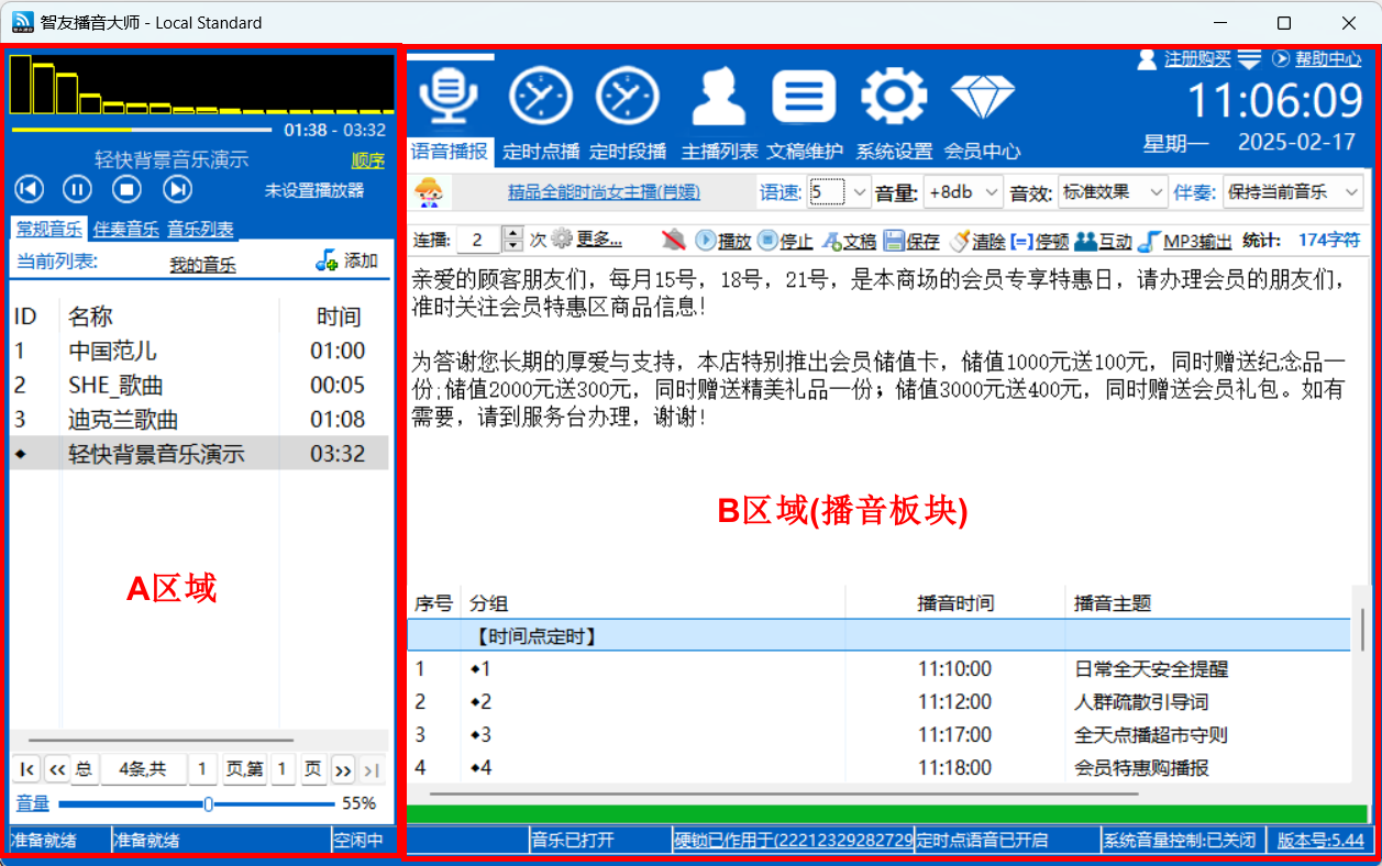 待进入主界面如下图:可以看到系统分为【A区域-音乐播放模块】和【B区域-播音管理模块】